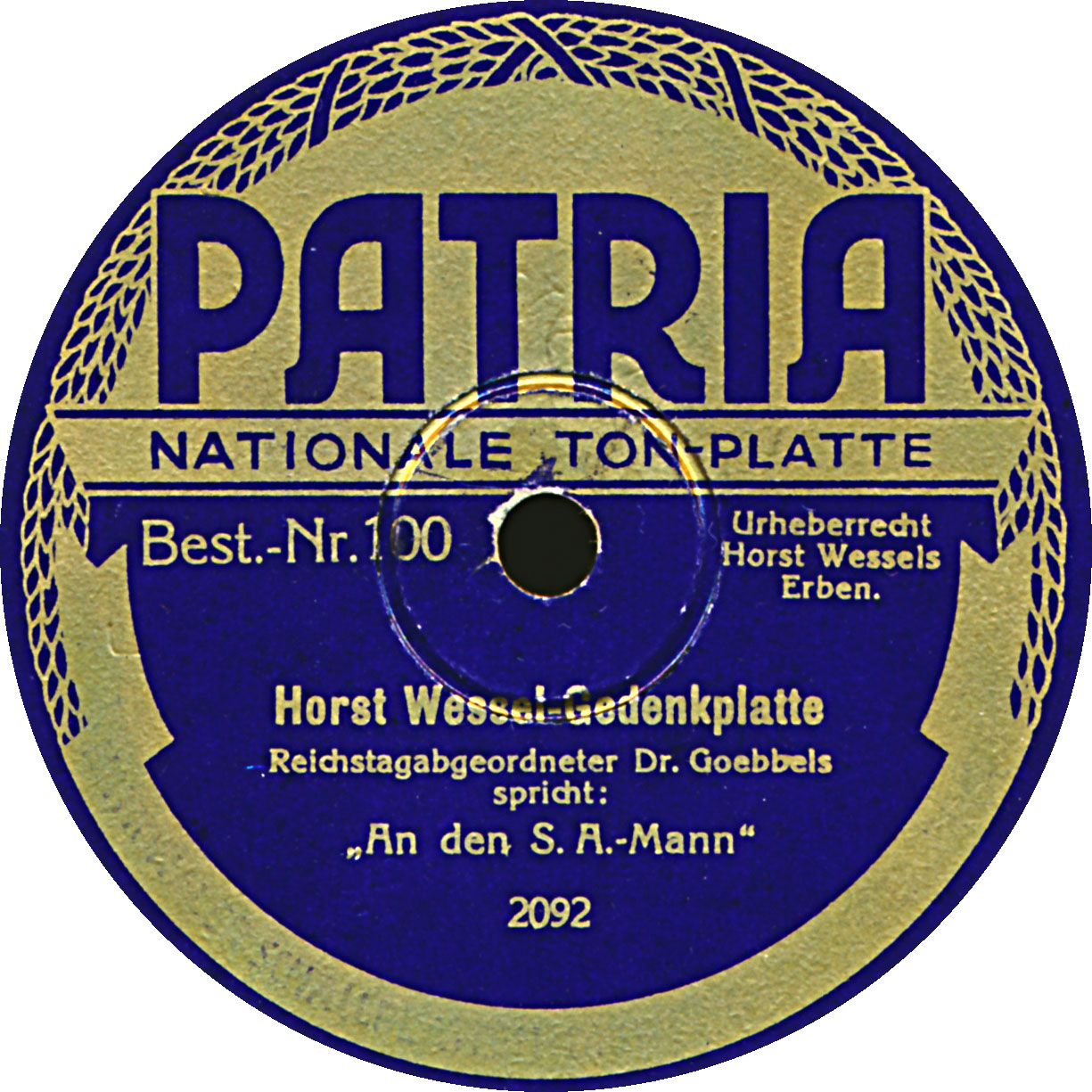 Paris, 1.1.1936, Hersteller: „Ste. D’Editions Phonographiques“ 95 Champs Elysées, Paris. Herausgeber,12,5 cm / 5 Inch! Schellack auf Pappe flexible Platte. Rückseite bedruckt. „L’Oeuvre Sociale de Mouvement Croix de Feu“ - „Famille - Travail - Bilan de 1935“,Die Croix de Feu (CdF; französisch; „Feuerkreuz“), im Deutschen auch Feuerkreuzler (im Plural) genannt, war eine rechtsextreme Organisation, auch „Liga“ genannt, in Frankreich, die zwischen 1927 und 1936 bestand. Nachdem sie durch die Volksfront-Regierung Léon Blums im Juni 1936 verboten wurde, gründeten ihre Anhänger im Monat darauf den Parti Social Français (PSF, „Französische Sozialpartei“) als Nachfolgeorganisation. Im Juli 1940, nach der Niederlage Frankreichs im Zweiten Weltkrieg, benannte sich die Partei in Progrès Social Français (PSF, „Französischer Sozialer Fortschritt“) um, wurde jedoch Anfang 1943 aufgelöst. Nach der Befreiung Frankreichs 1944 versuchten einige verbliebene Anhänger eine Neugründung als Parti Républicain Social de la Réconciliation Nationale („Republikanische Sozialpartei der Nationalen Versöhnung“), oder kurz Réconciliation Nationale (RN; „Nationale Versöhnung“), doch diese Partei verlor sich alsbald zwischen konservativen und gaullistischen Tendenzen der Vierten Republik.,Präsident der CdF war zu Beginn Maurice d’Hartoy, 1930 gefolgt von Maurice Genay. Seit 1931 stand Colonel François de La Rocque an der Spitze der Organisation, die unter ihm einen bedeutenden Aufschwung erlebte und sich von einer reinen Veteranenvereinigung zu einer paramilitärischen Massenbewegung mit einem verzweigten Netzwerk von Neben- und Unterorganisationen wandelte. La Rocque vollführte auch 1936 die Umwandlung in eine politische Partei (Parti social français, PSF) und blieb bis zu seiner Verhaftung durch die deutschen Besatzungsbehörden 1943 deren Führungsfigur. Die Gründung der Réconciliation Nationale im Jahr 1945 war ebenfalls auf La Rocques Initiative zurückzuführen, doch verstarb er Anfang 1946, was den Zerfall der Partei mit verursachte.,,François de La Rocque (* 6. Oktober 1885 in Lorient, Département Morbihan; † 28. April 1946 in Paris) war ein französischer Soldat und nationalistischer Politiker. 19301936 war er Führer der rechtsextremen Veteranenorganisation Croix de Feu, die er 1936 in die moderatere Parti social français umwandelte, die zu einer rechten Massenpartei wurde und als Vorläuferin des Gaullismus angesehen werden kann. , Quelle: Wikipedia |